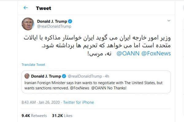 Dalam cuitannya di Twitter @realDonaldTrump, politisi Partai Republik itu menuliskan penolakan dengan menggunakan bahasa Persia, yang merupakan bahasa nasional Iran.