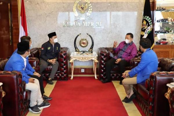 Ketua MPR RI Bambang Soesatyo saat menerima pengurus PMII, di Ruang Kerja Ketua MPR RI, di Jakarta, Selasa (16/2/21)