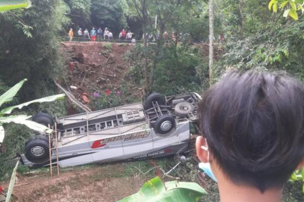 Bus wisata terguling di Sumedang, Jawa Barat. foto: kompas