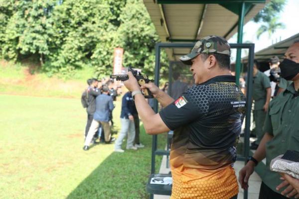 Ketua MPR RI Bambang Soesatyo saat mengikuti Kejurnas Menembak KASAU Cup 2021, di Lapangan Tembak Djamsuri Wing 1 Paskhas, Jakarta, Minggu (28/3/21).