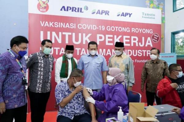 RIAU, Katakini.com - Ketua MPR RI Bambang Soesatyo meninjau pelaksanaan perdana vaksinasi Covid-19 Gotong Royong sektor industri tanaman Hutan yang dilakukan PT Riau Andalan Pulp and Paper (RAPP), terhadap para pekerjanya. Tahap awal, vaksinasi dilakukan terhadap 1.800 karyawan, dan akan ditingkatkan hingga seluruh karyawan yang mencapai tujuh ribu lebih bisa mendapatkan vaksinasi.