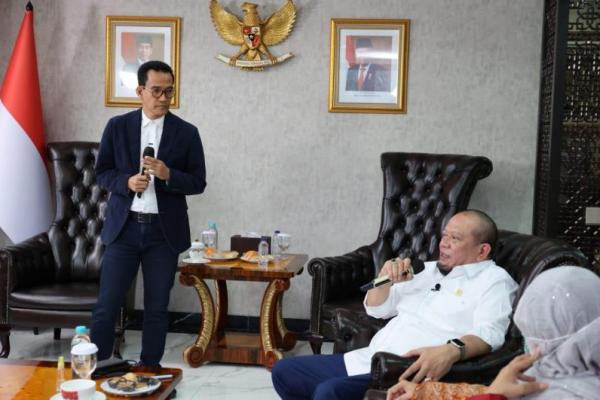 Ketua DPD RI AA LaNyalla Mahmud Mattalitti (duduk) bersama pakar hukum tata negara Refly Harun (berdiri). Foto: dpd/katakini.com