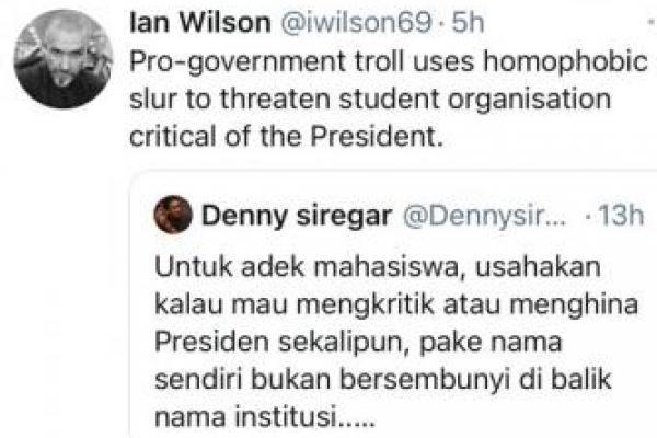 "Kelompok pro pemerintah menggunakan cercaan homofobia untuk mengancam organisasi mahasiswa yang kritis terhadap presiden," bunyi twit Ian lewat akun @iwilson69.