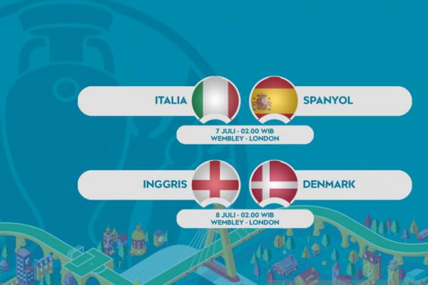 Italia akan meladeni Spanyol dan Inggris ditantang Denmark dalam dua pertandingan semifinal yang seluruhnya bakal dimainkan di Stadion Wembley, London, pada Rabu (7/7) dan Kamis (8/7) WIB.