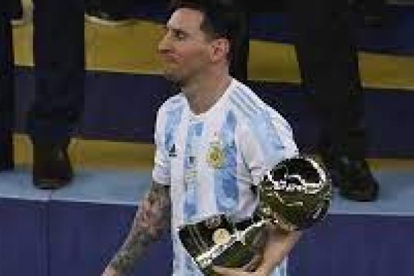 Lionel Messi memegang trofi Top Skor Copa America 2021 setelah timnas Argentina mengalahkan Brasil 1-0 di final yang bergulir di Stadion Maracana pada Minggu (11/7/2021), pagi hari WIB.(foto: MAURO PIMENTEL/ kompas.com) ,