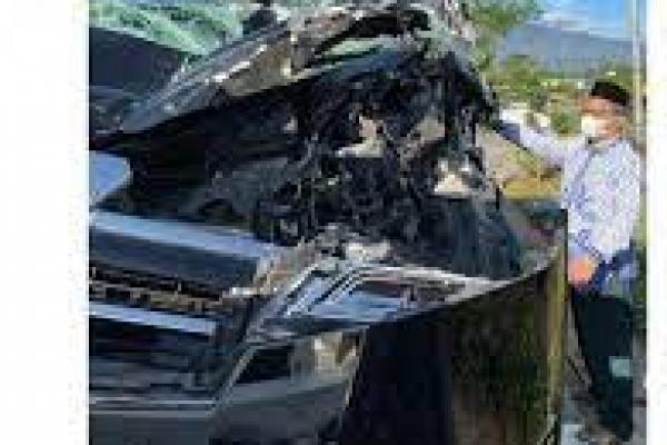 Kondisi mobil yang dikendarai Rois Aam PBNU KH Miftahul Akhyar yang mengalami ringsek seusai kecelakaan di Tol Semarang, Kamis (12/8/2021). (foto: tribunnews.com)