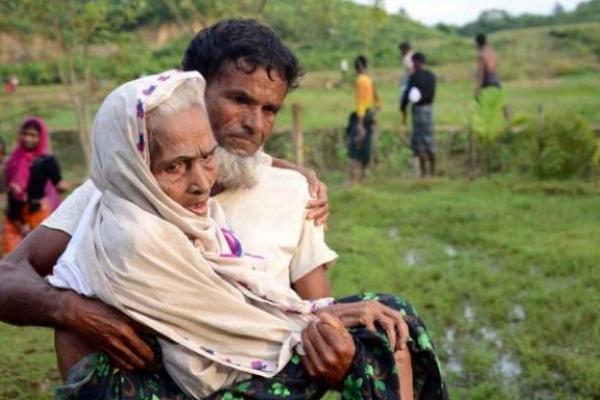Pengunsi Rohingya yang membawa orang tuanya meninggalkan Rakhine, Myanmar menuju Bangladesh pada 30 Agustus 2017. Ilustrasi (Foto: AFP)