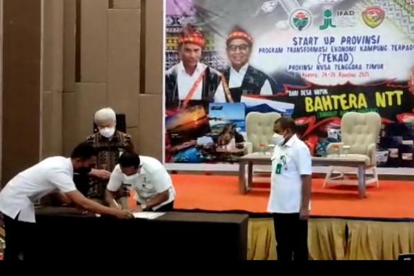 Menteri Desa PDTT, Abdul Halim Iskandar menandatangani MoU Program Transformasi Ekonomi Kampung Terpadu (Tekad) bersama Bupati Manggarai, Hery Nabit, Bupati Sumba Timur, Kristofel Praing dan Bupati Ngada, Paru Andreas di Aston Hotel Kupang.