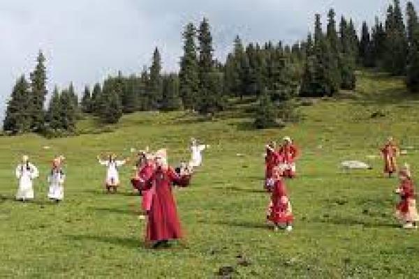 Gadis-gadis lokal yang mengenakan kostum nasional berjalan melalui pemandangan gunung yang indah ke Lembah Jyrgalan Kirgistan.(foto: euronews.com)
