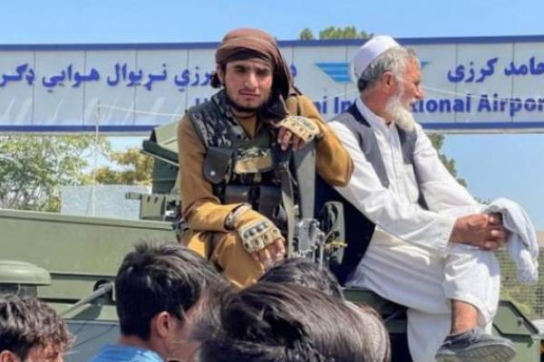 Seorang anggota pasukan Taliban duduk di atas kendaraan lapis baja di luar Bandara Internasional Hamid Karzai di Kabul, Afghanistan, pada 16 Agustus 2021. (Foto: Reuters/Stringer)