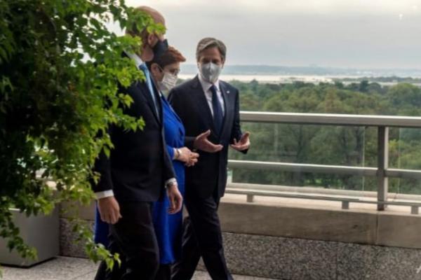 Menteri Luar Negeri AS Antony Blinken (kanan) berbicara dengan Menteri Pertahanan Australia Peter Dutton (kiri) dan Menteri Luar Negeri Marise Payne di Departemen Luar Negeri di Washington, DC, pada 16 September 2021. (Foto: Andrew Harnik/POOL/AFP)
