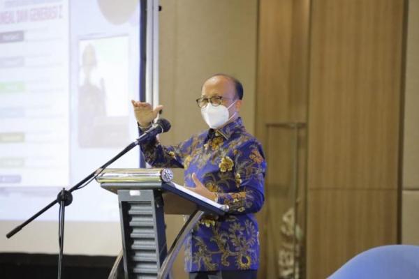 Sekretaris Jenderal Kemnaker Anwar Sanusi pada acara Temu Teknis Virtual bertajuk Pemanfaatan Sistem Informasi Ketenagakerjaan untuk Peneyampaian Informasi Pasar Kerja, pada Selasa (22/9/2021) di Surabaya.(foto: Biro Humas Kemnaker)