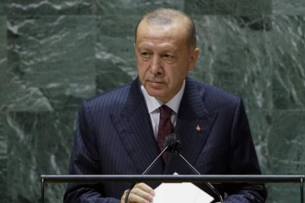 Presiden Turki Recep Tayyip Erdogan berpidato di Sidang ke-76 Majelis Umum PBB, Selasa, 21 September 2021 di markas besar PBB. Foto: CNA