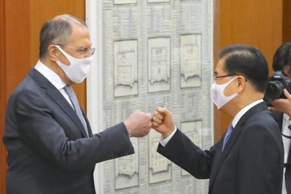 Menteri Luar Negeri Chung Eui-yong (kanan) dan Menteri Luar Negeri Rusia, Sergey Lavrov pada pertemuan 25 Maret 2021. (Foto: The Korea Herald)