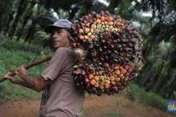 Ilustrasi. Seorang pekerja membawa tandan kelapa sawit. (foto: cnbcindonesia.com)