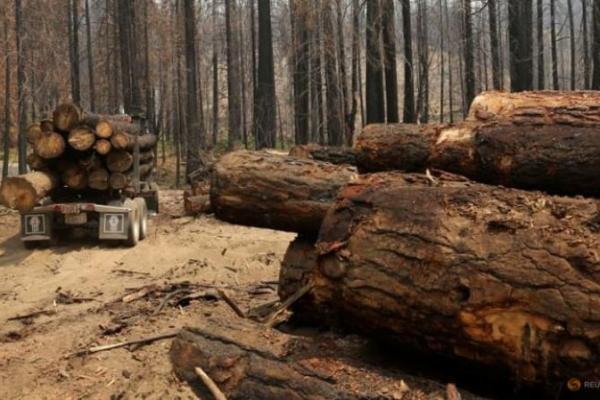 Sebuah truk kayu terlihat di antara pohon-pohon yang terbakar yang ditebang setelah kebakaran, dekat Groveland, California, 30 Juli 2014. (Foto: REUTERS/Robert Galbraith)