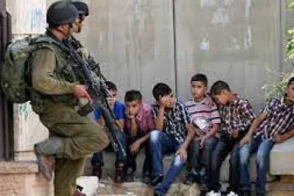 Anak-anak Palestina duduk didepan pasukan zionis Israel (foto: alray.ps)