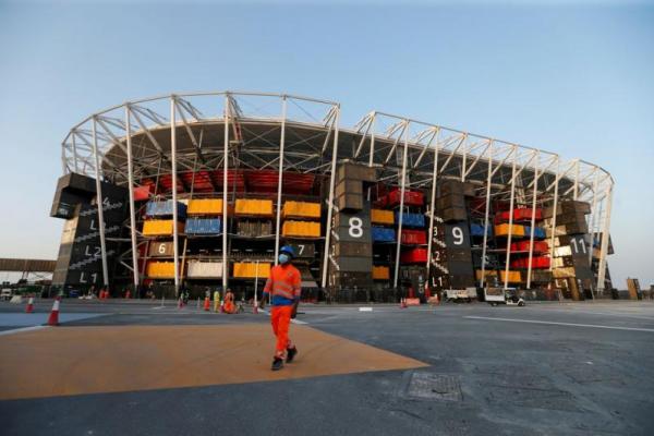 Seorang pekerja berjalan di depan Stadion Ras Abu Aboud, salah satu tempat penyelenggaraan Piala Dunia Qatar 2022, di Doha, Qatar, 17 November 2021. Foto diambil 17 November 2021. (Foto: Reuters)
