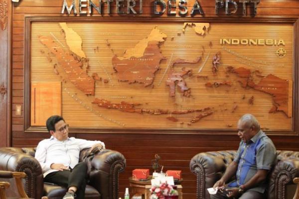 Menteri Desa, Pembangunan Daerah Tertinggal dan Transmigrasi (Mendes PDTT) Abdul Halim Iskandar (kiri) saat menerima Bupati Merauke, Romanus Mbaraka, di Kantor Kementerian Desa Pembangunan Daerah Tertinggal dan Transmigrasi (Kemendes PDTT), Kalibata, Jakarta, Selasa (14/12/2021). Foto: humas/katakini.com
