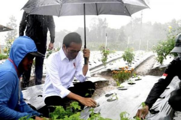 Presiden Joko Widodo menanam cabai di bawah guyuran hujan, di Wonosobo, Jawa Tengah
