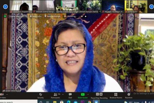 Wakil Ketua MPR RI, Lestari Moerdijat dalam diskusi virtual bertema Perempuan Indonesia: Kepemimpinan, Kesetaraan dan Kiprah Membangun Bangsa yang merupakan bagian dari acara peluncuran buku 21 Wanita Perkasa yang Ditempa oleh Budaya Aceh, yang digelar Forum Diskusi Denpasar 12 bersama Yayasan Sukma dan Universitas Syiah Kuala Aceh, Rabu (22/12).(foto: Humas MPR)