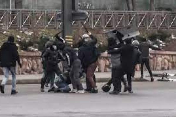 Tangkapan layar yang dibuat pada 5 Januari 2022, menunjukkan pengunjuk rasa bentrok dengan pasukan keamanan Kazakstan selama demonstrasi di Almaty (Foto: AFP/ aljazeera.com)