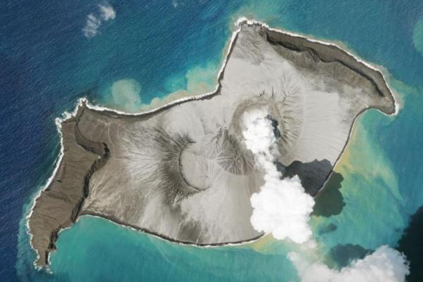 Gambar satelit menangkap letusan gunung berapi pada hari Sabtu ketika ledakan itu mengirimkan gumpalan asap ke udara dan sekitar 12 mil di atas permukaan laut. Langit di atas Tonga digelapkan oleh abu.