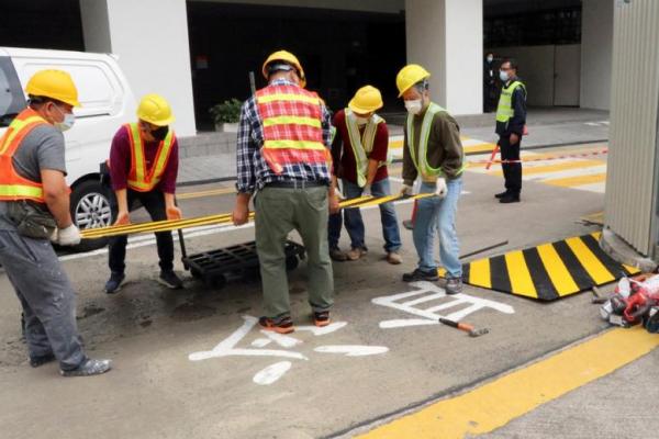 Seorang jurnalis Reuters menyaksikan sekitar selusin pekerja konstruksi yang mengenakan topi proyek berwarna kuning mendirikan papan konstruksi logam abu-abu di sekitar "slogan martir" yang dilukis di sepanjang jembatan Swire Universitas Hong Kong (HKU).