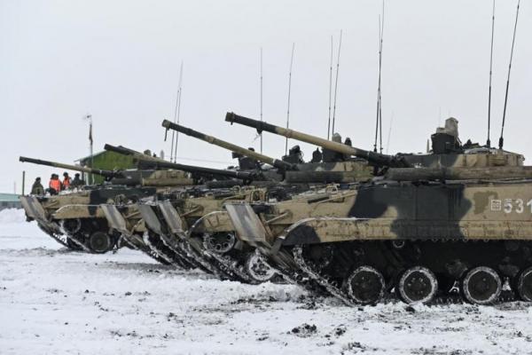 Sebuah pemandangan menunjukkan kendaraan tempur infanteri BMP-3 Rusia selama latihan yang diadakan oleh angkatan bersenjata Distrik Militer Selatan di jajaran Kadamovsky di wilayah Rostov, Rusia 27 Januari 2022. (Foto: Reuters)