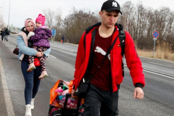 Banyak warga Ukraina menyeret komper mereka dan berjalan kaki ke Hungaria untuk mencari tempat aman. Foto: Reuters