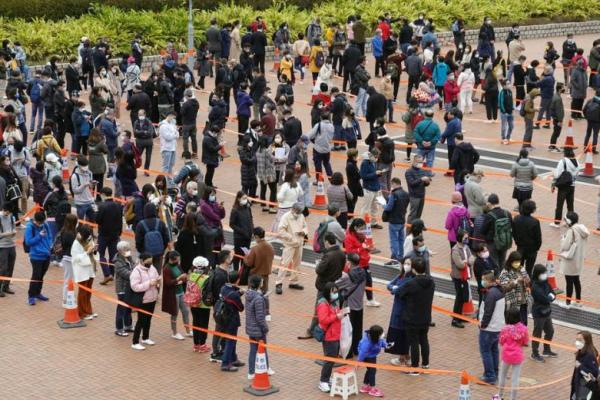 Antrean panjang pengujian Covid di Hong Kong yang memakan waktu sangat lama di tengah melonjaknya kasus baru. Foto: Reuters