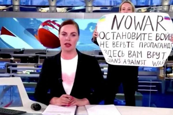 Pengunjuk rasa tersebut mengangkat poster di belakang presenter studio yang membacakan berita di Channel One pada Senin malam dan meneriakkan slogan-slogan yang mengutuk invasi Rusia ke Ukraina pada 24 Februari.