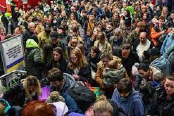 Orang-orang yang melarikan diri dari perang di Ukraina menaiki kereta kemanusiaan di Krakow, Polandia, yang menuju Berlin (foto: cnn.com)