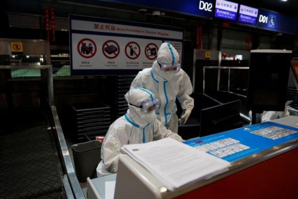 Staf maskapai mengenakan alat pelindung diri saat mereka bekerja di bandara Beijing, China. Foto: Reuters