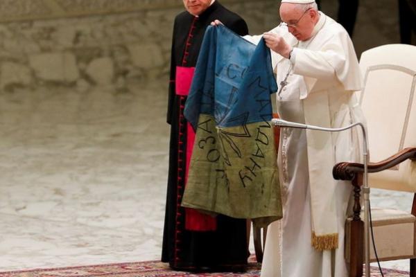 Paus Fransiskus memegang bendera Ukraina yang dikirimkan kepadanya dari kota Bucha. (FOTO: REUTERS)