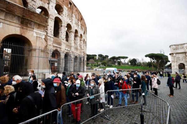 Orang-orang mengantre sebelum memasuki Colosseum saat Italia mulai melonggarkan beberapa pembatasan Covid. Foto: Reuters