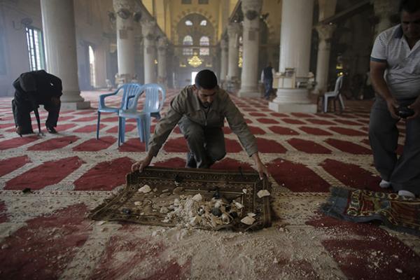 Warga Palestina membersihkan masjid Al-Aqsa pada hari Jumat setelah serangan oleh pasukan Israel (foto: Reuters)