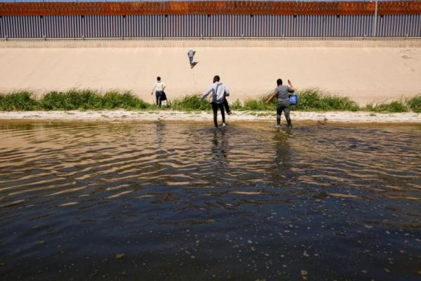 Migran pencari suaka berjalan keluar dari sungai Rio Bravo setelah menyeberanginya, di El Paso. Foto: Reuters