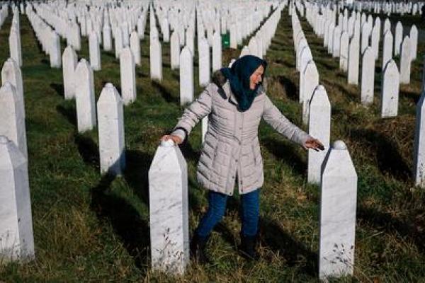 Ilustrasi. Seorang wanita berduka atas makam kerabatnya di pusat peringatan Potocari dekat Srebrenica pada 22 November 2017. (foto: AFP/trtworld.com)