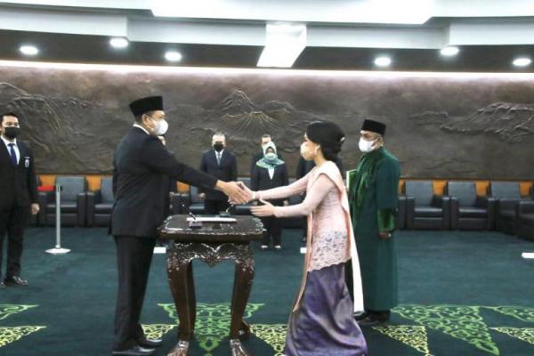Bamsoet saat melantik pergantian antar waktu (PAW) anggota MPR RI yang juga anggota Komisi III DPR RI dari Fraksi Partai Gerindra, Siti Nurizka Puteri Jaya, di komplek MPR/DPR/DPD RI, Selasa (17/5/22). (foto: Humas MPR)