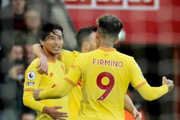 Takumi Minamino (kanan) melakukan selebrasi dengan rekan setimnya usai mencetak gol penyeimbang untuk Liverpool dalam pertandingan Liga Inggris lawan Southampton pada 18 Mei 2022.(foto: sportingnews.com)