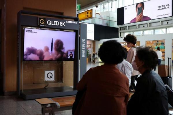 Orang-orang menonton TV yang menyiarkan laporan berita tentang peluncuran tiga rudal Korea Utara, di Seoul, Korea Selatan. Foto: Reuters