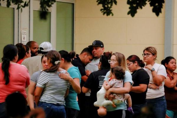 Orang-orang bereaksi di luar Ssgt Willie de Leon Civic Center, tempat para siswa dipindahkan dari Robb Elementary, Texas setelah penembakan massal. Foto: Reuters