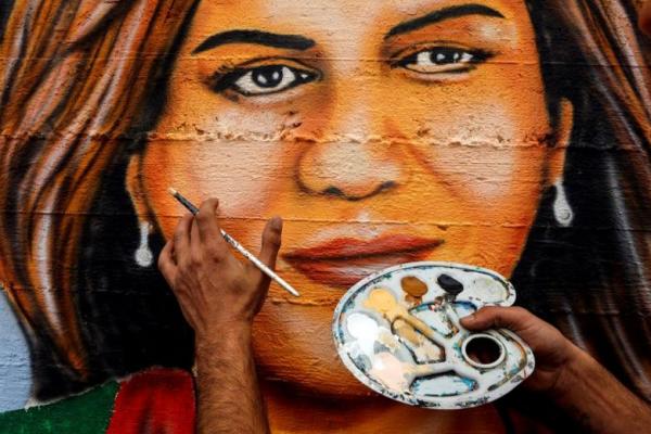Seniman Jaber Abbas membuat mural untuk menghormati jurnalis Al Jazeera, Shireen Abu Akleh, yang ditembak mati dalam serangan militer Israel. Foto: Reuters