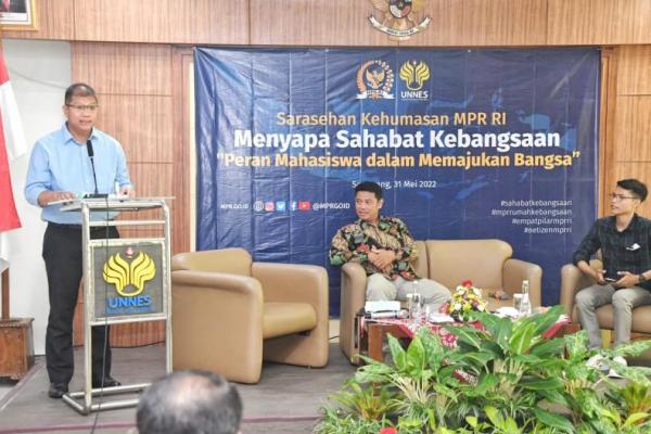 Kepala Bagian Pemberitaan dan Hubungan Antarlembaga Setjen MPR Budi Muliawan saat menjadi pembicara dalam dialog bertajuk ‘Peran Mahasiswa dalam Memajukan Bangsa’ dan sarasehan bertajuk Menyapa Sahabat Kebangsaan’ di Gedung Prof. Ir. Retno Sriningsih, Kampus Universitas Negeri Semarang (Unnes), Semarang, Jawa Tengah, Selasa (31/5/2022).(foto: Humas MPR)
