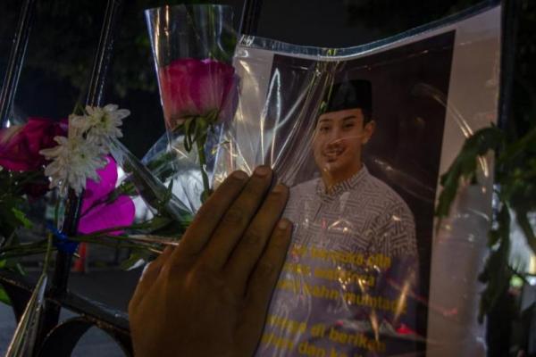Warga memegang foto almarhum Emmeril Khan Mumtadz yang dipajang di pagar sebagai ungkapan belasungkawa di Gedung Negara Pakuan, Bandung, Jawa Barat, Sabtu (4/6/2022).(foto: ANTARA)