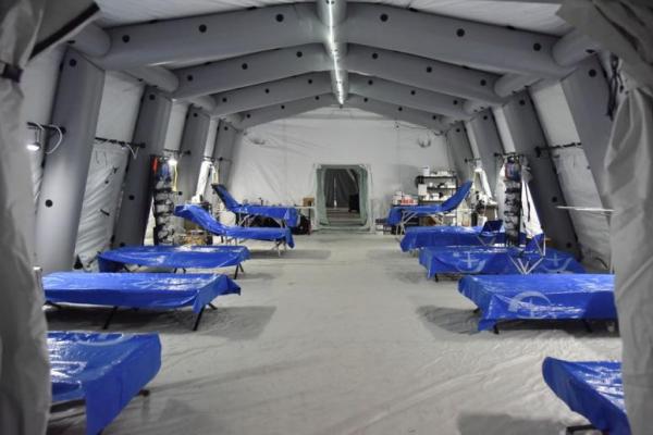 Tempat tidur kosong terlihat di rumah sakit lapangan yang dikerahkan oleh dokter Amerika di tempat parkir bawah tanah pusat perbelanjaan King Cross Leopolis, Ukraina. Foto: Reuters