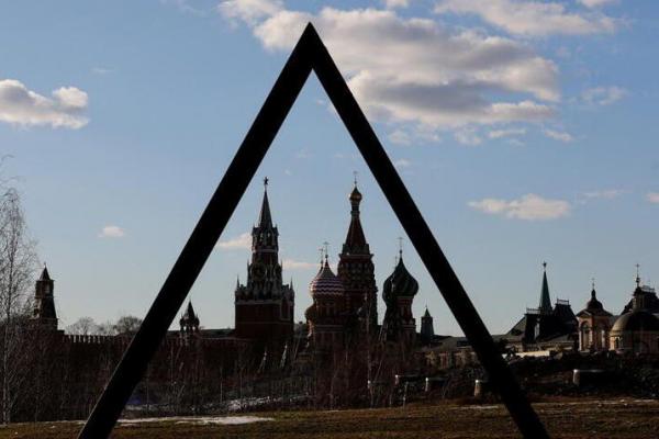 Menara Spasskaya Kremlin dan Katedral St. Basil terlihat melalui objek seni di taman Zaryadye di Moskow, Rusia, 15 Maret 2022. Foto: Reuters