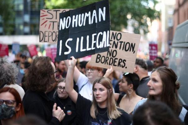 Para pengunjuk rasa berdemonstrasi di luar gedung Home Office menentang rencana Pemerintah Inggris untuk membawa para pencari suaka ke Rwanda. Foto: Reuters