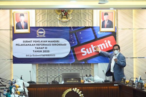 JAKARTA - Sekretariat Jenderal (Sekjen) DPR RI Indra Iskandar melakukan submit tahap III Penilaian Mandiri Pelaksanaan Reformasi Birokrasi (PMPRB). Hal ini sesuai amanat PermenPAN RB Nomor 26 Tahun 2020 Tentang Pedoman Evaluasi Pelaksanaan Reformasi Birokrasi.